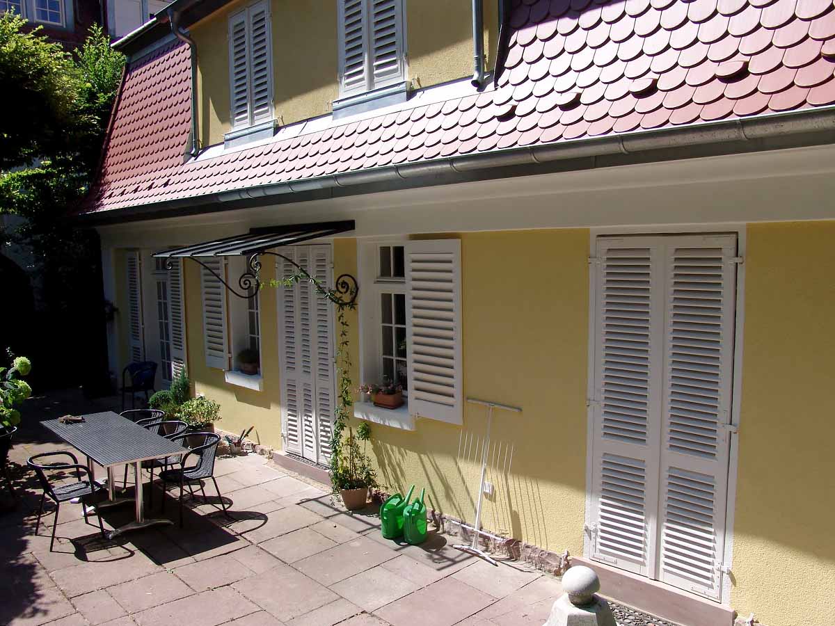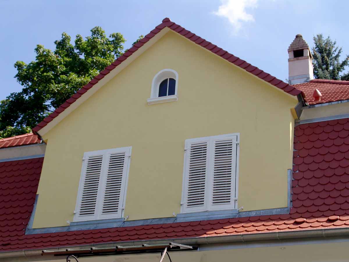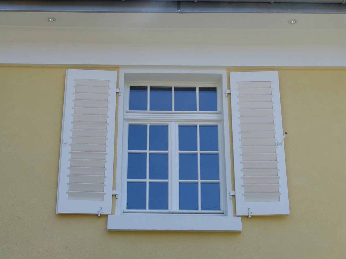 Neue Fenster und restaurierte FensterlädenBei diesem Gebäude haben wir nicht nur alle Fenster des Herstellers Pax geliefert und eingebaut, sondern auch die zum Großteil noch vorhandenen Fensterläden restauriert und wo notwendig durch Nachbauten ergänzt. Bei diesem Objekt erkennt man sehr schön die elegante Wirkung der schmalen Querschnitte der Fensterkanteln und -sprossen, gerade auch in den Räumen in denen zwei oder mehr Fenster nebeneinander stehen wird deutlich, dass ein Fenster eben mehr als nur ein durchsichtiges »Loch« in der Wand ist, durch dass das Licht eindringen soll. Die Sprossen der Fenster gliedern den Raum und schaffen zudem eine visuelle Grenze zwischen Innen und Außen. Das ist nicht immer gewünscht, aber bei historischen Objekten in aller Regel die stilitisch angemessene Lösung. Die elegante aber insgesamt zurückhaltende Wirkung des Gebäudes wird durch das helle Gelb der Wände und dem Weiß der Fenster, Türen und vor allem auch der Fensterläden unterstrichen. bei diesem Objekt wird besonders deutlich, wie Fenster und Fensterläden eine gestalterische Einheit bilden.