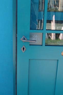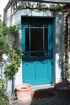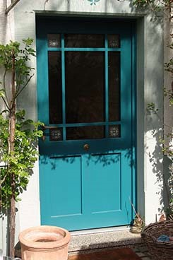 Neubau und Einbau einer historischen Haustür als EcksprossentürUnsere Kunden kommen mit den unterschiedlichsten Vorlagen zu uns, auf deren Grundlage wir mit unserer Arbeit beginnen: Manchmal, selten, ist es ein Plan, manchmal auch nur eine Idee, manchmal sind es ein oder zwei Türgitter oder ein Foto aus dem Urlaub. Manchmal ist die Vorlage aber auch eine ganze Tür. In diesem Fall war es eine typische Wohnungstür der Jahrhundertwende, also eine Ecksprossentür mit bunten Glasecken, die die Kundin als Haustür in einem Hinterhof gebaut haben wollte. Wir haben die Tür den notwendigen Rahmenmaßen entsprechend angepasst und diese sehr lichtdurchlässige Haustür gebaut. Die farbigen Eckgläser sind übrigens nur aufgeklebt, als wir das vor Jahren zum ersten Mal gemacht haben, waren wir selbst ein wenig skeptisch, ob das eine dauerhafte Methode ist, aber sie ist es.