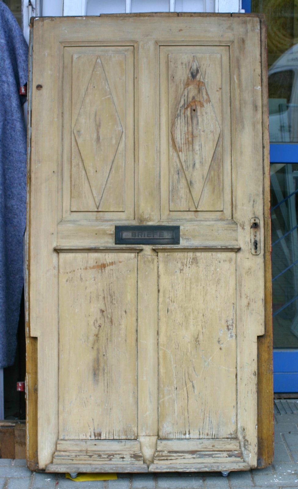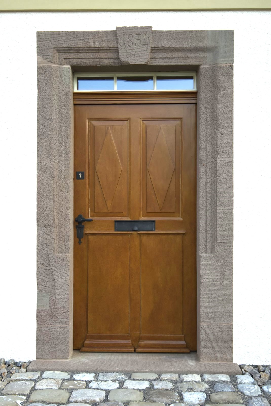 Die historische Biedermeier-Haustür, die Außenseite in typischer Zeitmanier mit großen Rauten und überschobenen Füllungen, die Innenseite als Brettertür, würde von uns komplett restauriert und in einen neuen Rahmen eingebaut. Der Rahmen enthält ein schmales Oberlicht als Festverglasung.