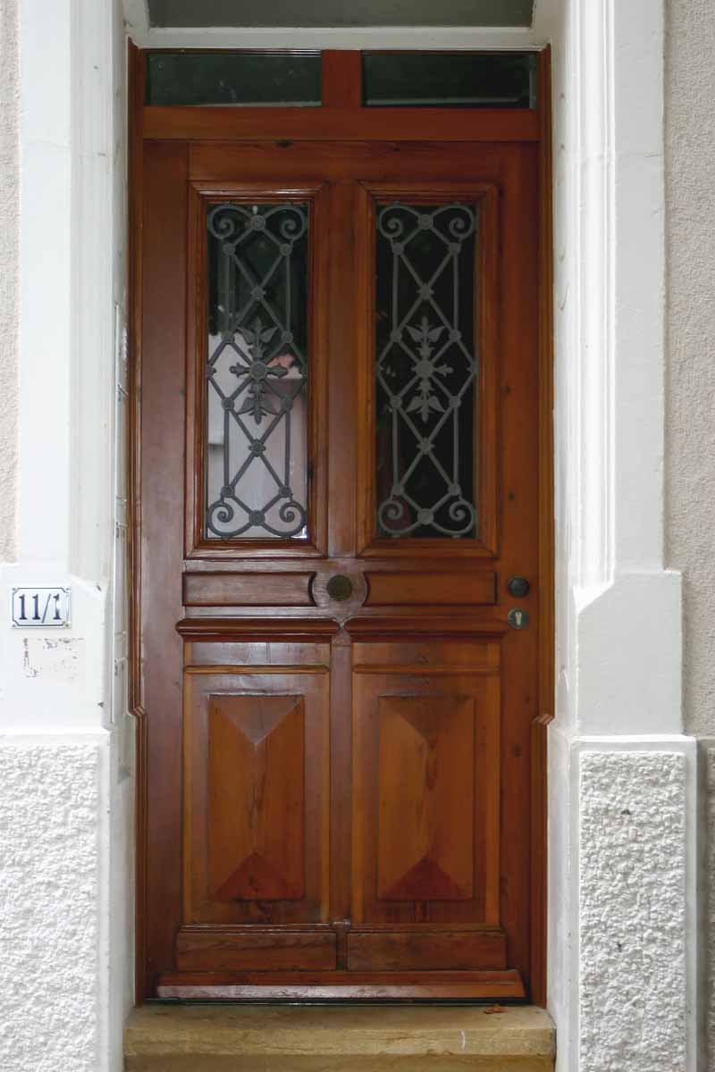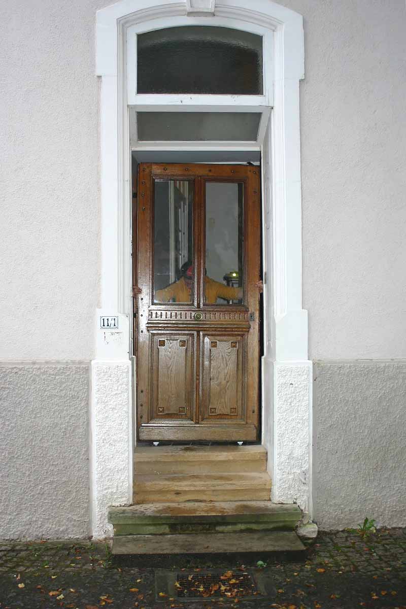 Restaurierung und Einbau einer HaustüreWenn man sich nicht so recht entscheiden kann, welche Haustüre nun besser ins Haus passt, macht man am besten eine Anprobe. So geschehen bei diesem Objekt in Kandern. Die in der Anprobe befindliche Tür war dann nicht die Gewinnerin des Schönheitswettbewerbes, gewonnen hat eine Haustür, die insgesamt ein wenig einfacher gehalten war und deshalb deutlich besser zum Haus passte. Die Haustür würde von uns restauriert, nicht aufgedoppelt, mit einem neuen Rahmen samt zweigeteiltem Oberlicht versehen und eingebaut.