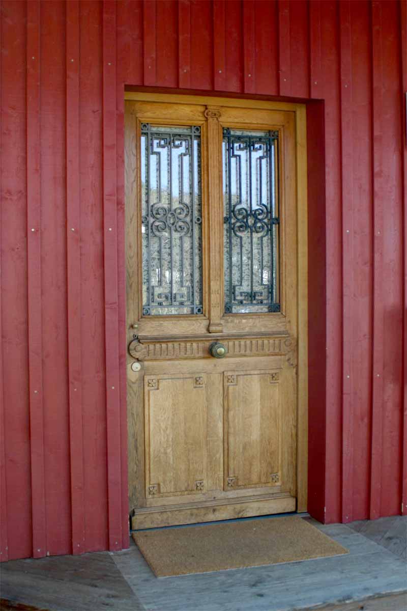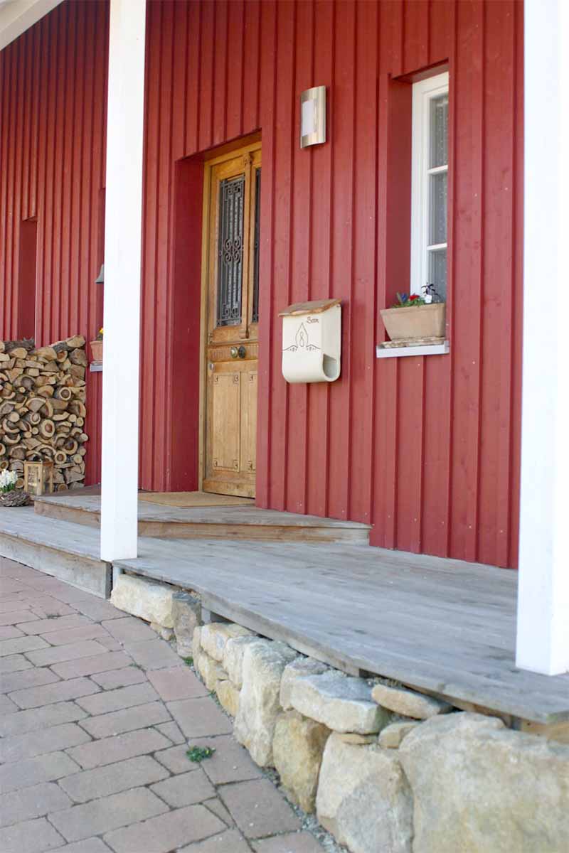 Der Kontrast zwischen der rot bemalten Boden-Deckel-Schalung und der holzsichtigen historischen Tür könnte größer kaum sein. Die Tür ist an dieser Stelle konstruktiv durch einen großen Dachüberstand von Schlagregen geschützt und kann an dieser Stelle noch einmal ein weiteres Jahrhundert erleben.