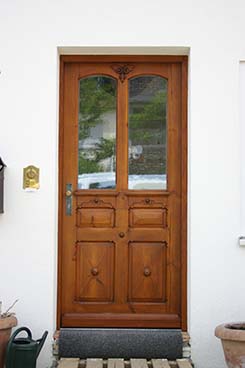 Auch diese Tür hat von den Maßen her mit ein wenig Spielen beim Rahmen recht gut gepasst, wie üblich haben wir sie aufgedoppelt und mit einer Mehrfachverriegelung ausgestattet. Der Bauherr wollte auf die bei diesem Typ üblichen Fenstergitter verzichten, nicht aber auf das schlierige Aussehen von altem Glas. Die Glasausschnitte sind daher in zwei Ebenen ausgeführt, in die alte Tür wurden etwa 100 Jahre alte, produktionsbedingt leicht wellige Glasscheiben eingesetzt, in die Aufdoppelung neues Isolierglas.