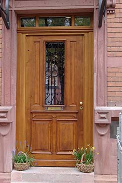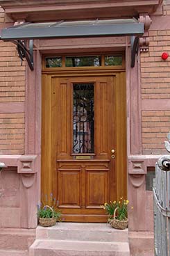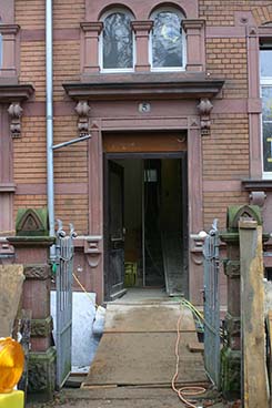 Restaurierung und Einbau einer historischen Haustür mit vergittertem GlasausschnittAn dieser Stelle war ursprünglich einmal mit ziemlicher Sicherheit eine zweiflügelige Haustür montiert, die durch eine ziemlich breite, aber eben nur einflügelige Haustür ersetzt werden sollte. Damit der Rahmen nicht einfach nur als »Brett« wahrgenommen wird, haben wir ihn zweistufig in Eichenholz ausgeführt. Zusammen mit dem ähnlich breit wahrgenommenen Oberlicht ergibt der Aufbau am Ende wieder ein harmonisches Bild. Die farbliche Abstimmung von alter Tür und neuem Rahmen ist bei holzsichtiger Ausführung immer ein wenig heikel, aber wie diese Tür zeigt, durchaus machbar. Auch diese Tür wurde von uns aufgedoppelt, mit einer Mehrfachverriegelung und Isolierglas ausgestattet. Sehr wichtig, nicht nur, aber gerade bei holzsichtig ausgeführten Haustüren, ist der konstruktive Wetterschutz, der hier durch das neue Vordach gewährleistet wird. Standort: Heidelberg, Hospiz Louise |