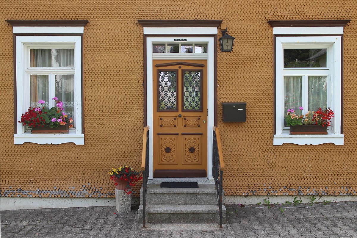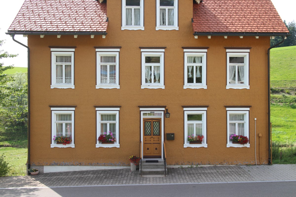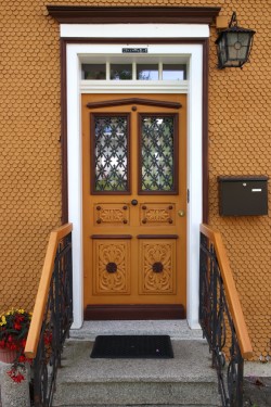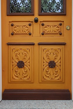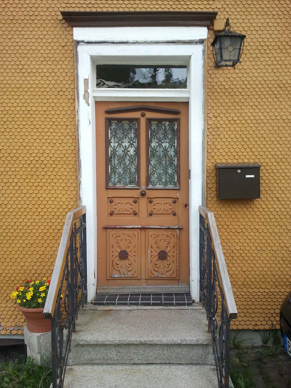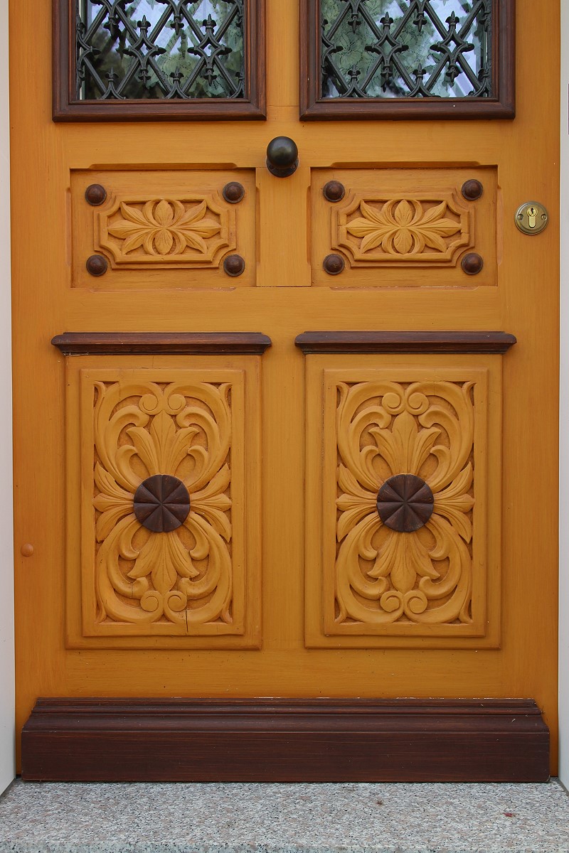 Neubau/Restaurierung einer historischen Haustüre unter Verwendung von Teilen einer alten TürDieses Haus steht im Schwarzwald auf etwa 1000 Metern in einem Ort, der nicht in erster Linie für sein schönes Wetter berühmt ist. Zudem steht das Haus direkt an einer leicht abschüssigen Straße, so dass hier nicht nur mit Schlagregen, sondern auch mit von den Räumfahrzeugen aufgeworfenem und zudem auch noch salzigem Schneematsch zu rechnen ist. Alles andere als optimale Bedingungen für eine Haustür. Die Tür selbst ist etwa aus der Jahrhundertwende und mit sehr vollständig geschnitzten Füllungen ausgeführt worden, an Holzschnitzern hat es im Schwarzwald zu der Zeit nicht gemangelt. Die Schnitzereien sind eine typische Verschmelzung des Historismus mit seiner gerne auch einmal die Grenzen des Vernünftigen überschreitenden Fixierung auf das Ornament und einer lokalen Handwerkstradition, die aus einer ganz anderen Ecke kommend, sich einfach lustvoll dem Schnörkel hingibt. Während die Füllungen noch in einem rettbarem Zustand waren, war der Rest der Tür mehr oder minder ein Totalschaden. Wir haben in Absprache mit dem Bauherren eine neue Tür unter Nutzung der historischen Füllungen und natürlich auch des Türgitters gebaut. Die Tür ist mit einer Mehrfachverriegelung und Isolierglas ausgerüstet. Die farbliche Einfassung ist bei dieser Tür aus zwei Gründen angeraten gewesen. Einmal schützt sie das Holz vor der Witterung, gleichzeitig verbessert sie die Wahrnehmung der Schnitzereien. Standort: Neukirch