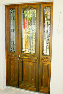 Diese recht aufwendige Haustür aus dem späten 19. Jahrhundert haben wir im Auftrag des Kunden gerichtet, aufgedoppelt, mit Isolierverglasung und Mehrfachverriegelung ausgestattet und vor Ort eingebaut. Die Herausforderung bei zweiflügeligen Türen ist natürlich immer der winddichte Verschluß, der aber im Rahmen der Aufdoppelung in der Regel gut realisierbar ist. Statt der historischen Doppelgarnitur mit zwei Türklinken wurde hier lediglich ein Schließzylinder eingebaut, die Tür wird von außen mit dem Quergriff zugezogen.
