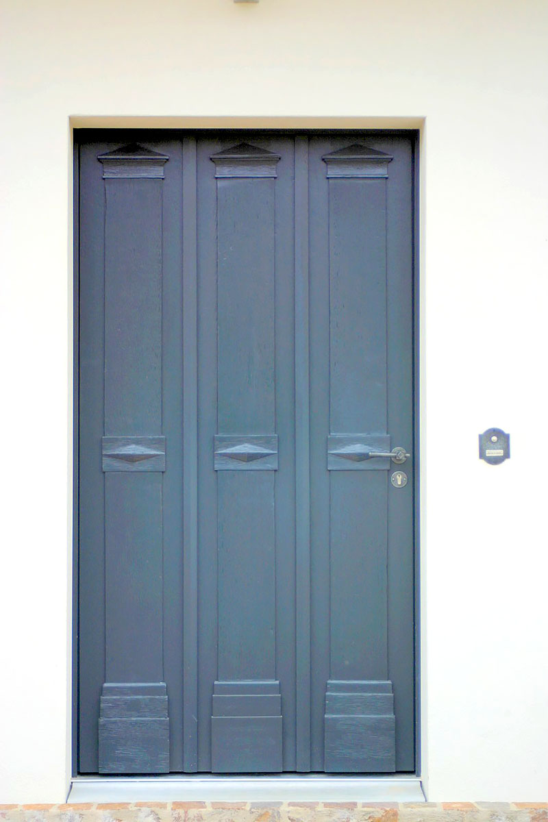 Restaurierung und Einbau einer BiedermeiertürEine mittlerweile häufig von uns praktizierte Methode eine alte Tür auch im Neubau wiederzuverwenden, ist ein »Sandwich« daraus zu machen. Diese Methode bietet sich besonders bei aufgedoppelten Türen wie dieser wunderbaren Biedermeiertür aus der ersten Hälfte des 19. Jahrhunderts an. Die Biedermeiertür, bestehend aus einer einfachen Innenseite aus breiten Brettern und der repräsentativen und auch heute noch sehr elegant wirkenden Aussenseite, wurde von uns auseinandergebaut, wo nötig repariert und restauriert. Innen- und Außenteil wurden dann auf einen modernen Türenrohling montiert, der alle Vorgaben hinsichtlich Dämmung und alle Wünsche hinsichtlich technischer Sicherheit erfüllt. Anschließend wurde die Tür farblich gefasst. Diese Vorgehensweise stellt hinsichtlich Wärmeschutz und Sicherheit eine Lösung dar, die die jeweils geltenden Anforderungen sicher erfüllt. Die alte Tür dient dabei »nur« als Verkleidung. Diese Technik ermöglicht häufig eine Wiederverwendung alter Türen ohne substantielle Eingriffe in deren Strukturen. Standort: Kanton Aargau, Schweiz