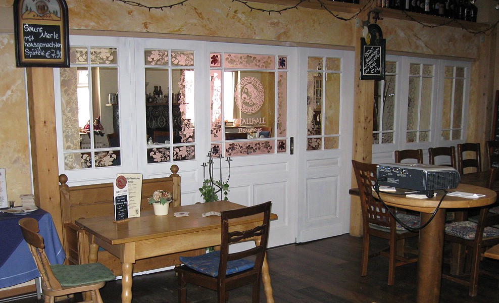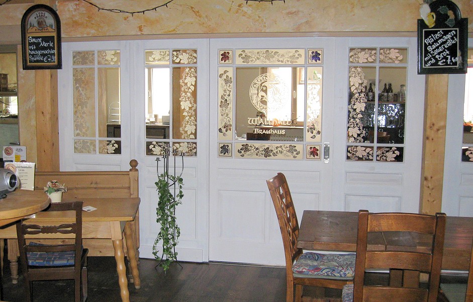 Nachbau von Zimmertüren nach historischen VorbildernStandort: Bruchsal Aus verschiedenen historischen Glasabschlußtüren haben wir hier einen komplett verschiebbaren Raumtrenner erstellt. Die Türen wurden von uns für diesen Zweick auf- und umgearbeitet und dabei auch etwas ertüchtigt. Für den Alltagsbetrieb läßt sich eine kleine Schlupftür seitlich öffnen, für größere Veranstaltungen kann die ganze, dreiteilige Front zur Seite verschoben werden.