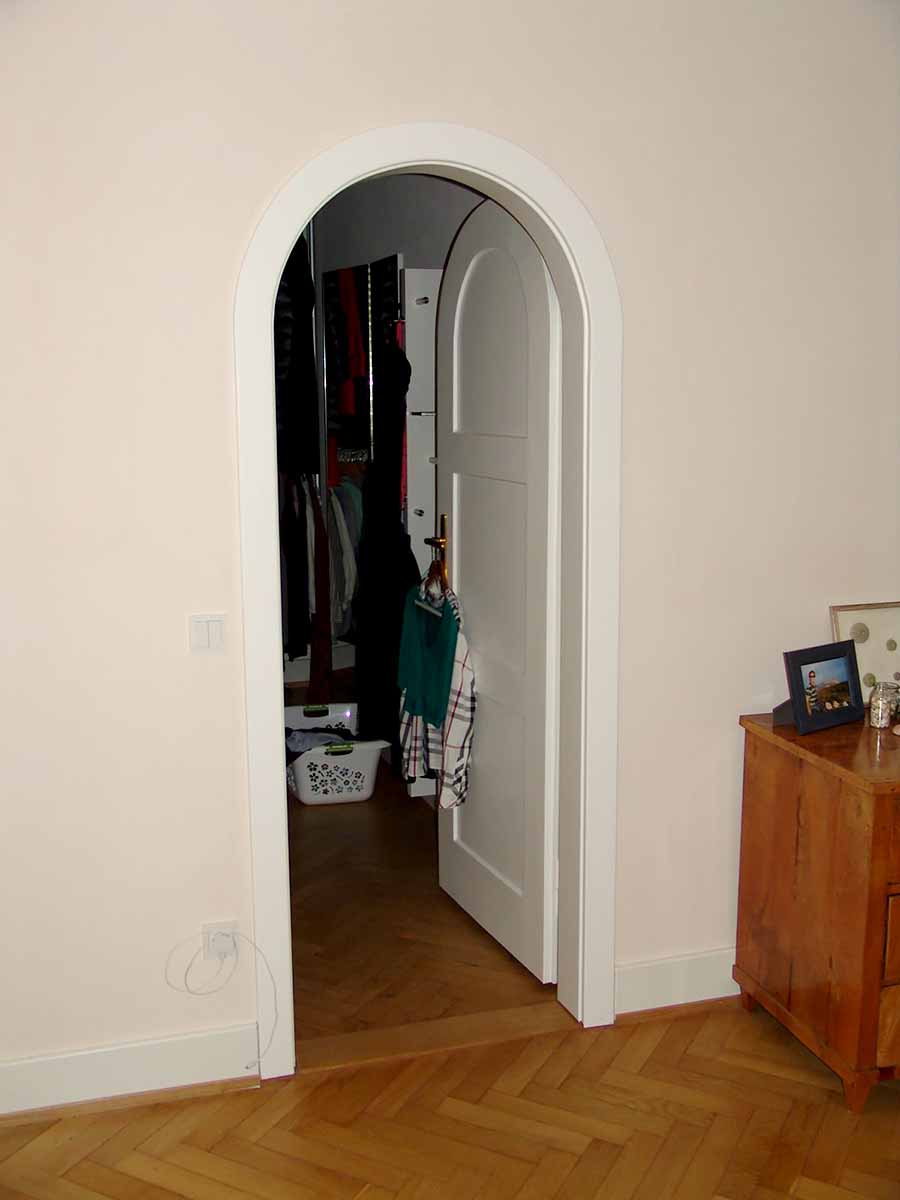 Nachbau von Zimmertüren nach historischen VorbildernFür die 20er-Jahre nicht ganz untypisch sind nebentüren im Innenbereich die als Rundbogentüren ausgeführt wurden. Hier stellte sich im Laufe der Restaurierung heraus, dass das Rahmenmaterial in den 20er-Jahren eher aus Resten zusammengeklaubt worden war und sich die Rahmen teilweise quasi von alleine auflösten. Hier haben wir im Rahmen der Restaurierung und farblcihen Neufassung einen passenden Rundbogenrahmen zur Innentür erstellt.