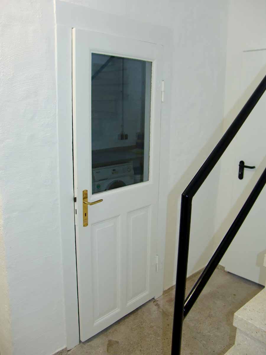 Restaurierung von Zimmertüren nach historischen VorbildernDie Innentüren des Objektes wurden von uns restauriert und farblich neu gefasst, sowie mit neuen Beschlägen versehen und dabei teilweise auch umgeschlagen. Bei der Tür zum Waschraum im Souterrain haben wir die beiden oberen Füllungen durch eine Glasscheibe ersetzt.